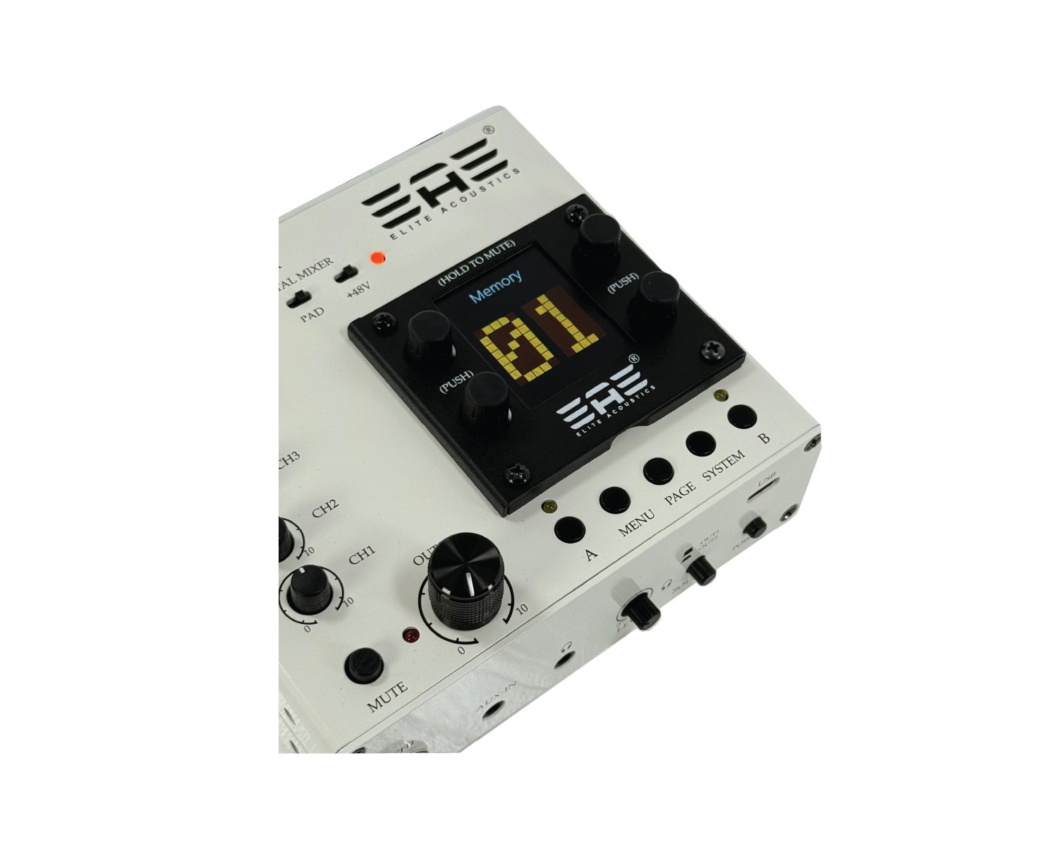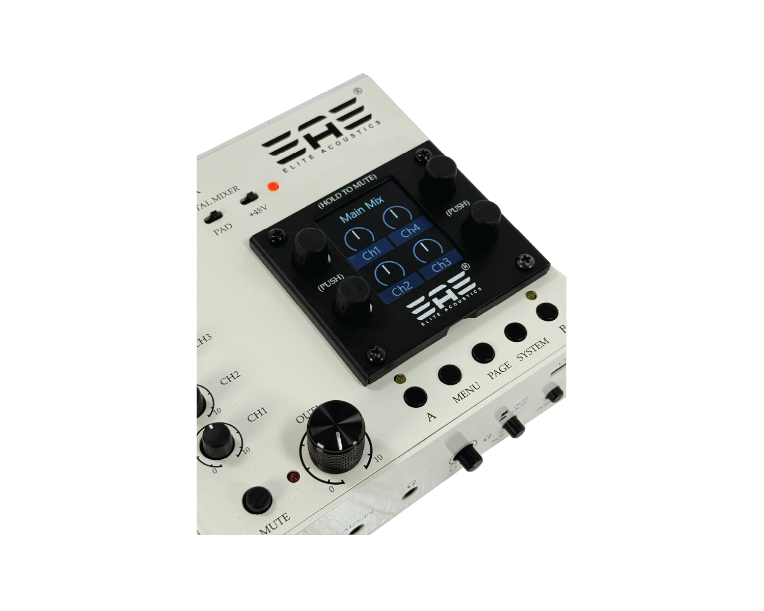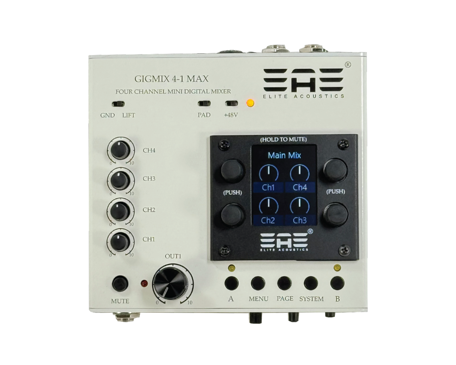 GigMix 4-1 MAX mini Digital mixer, porting the engine from the StompMix 4, the GigMix 4-1 MAX is built with a powerful 32-bit 100Mhz DSP engine and a compact lightweight pocket size package. The GigMix 4-1 MAX mini digital mixer offers a full featured, highly intuitive four channels Digital Mixer with a Color Display. 4 effects level control for Reverb and Shimmer. Assignable Delay effects. The DSP engine provides a compressor, Gate, Mid sweepable EQ, Highpass Filter, Notch Filter, Phase reverse to each of the 4 inputs. Analog inputs consisted of 1 Class A solid-state Mic pre-amps and three 1/4″ TS line/Instrument inputs. Two sets of stereo Mix outputs are selectable between a 1/4″ TRS jack and 2 XLR jacks with output level control knob . 2 assignable switches. 10 Memory for easy recall and set up. Mic Stand mounting accessory is also available. The size/functionalities of the Gigmix 4-1 MAX mini digital mixer makes it the great pocket live gig mixer to your guitar/vocal setup.